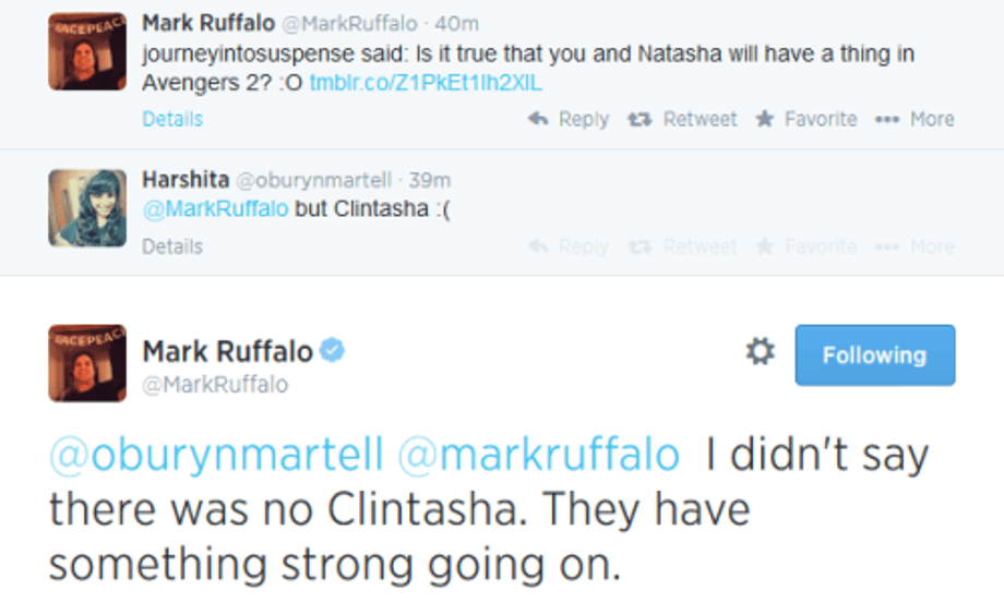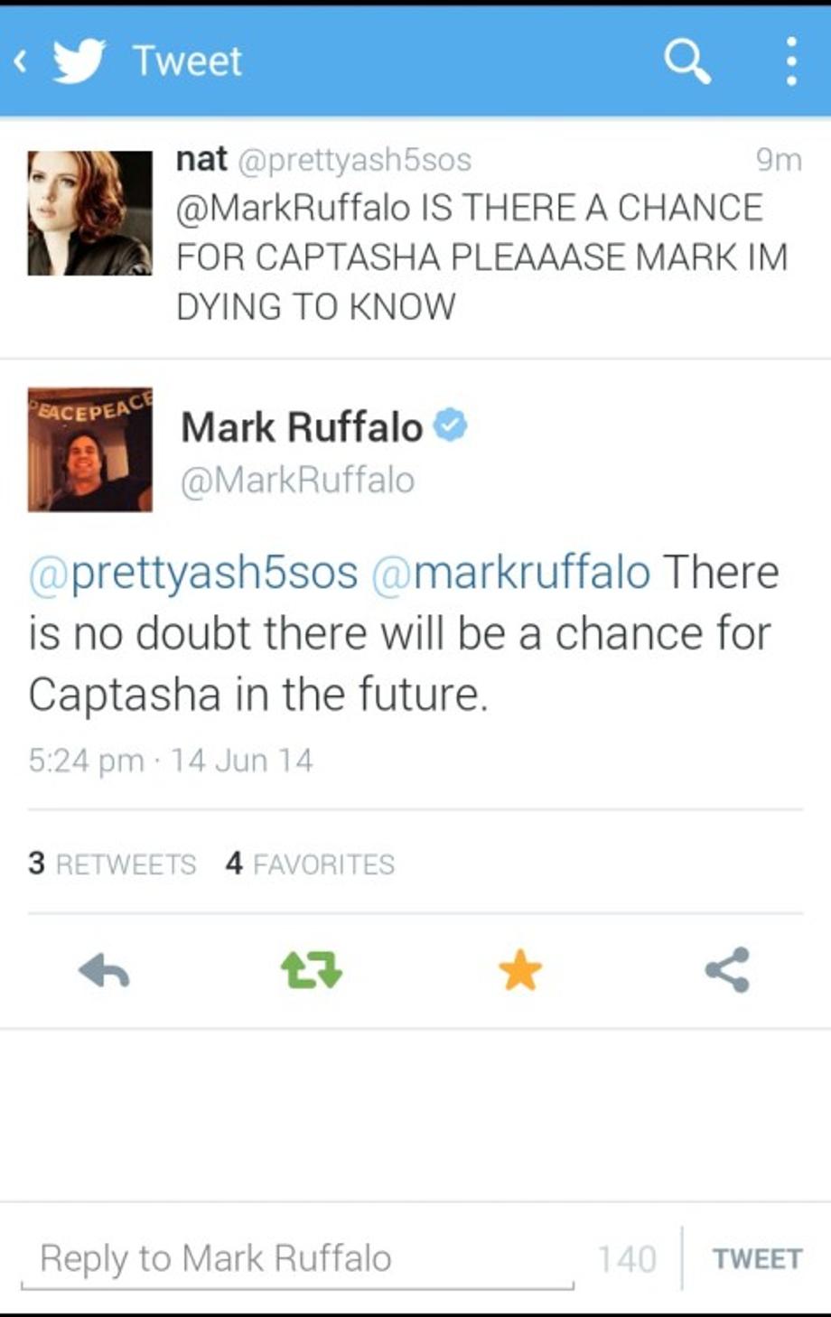 Continuing his friendly fanservice on both Tumblr and Twitter, Mark Ruffalo answers to the latest Age Of Ultron-romance rumors, leaving all options open.