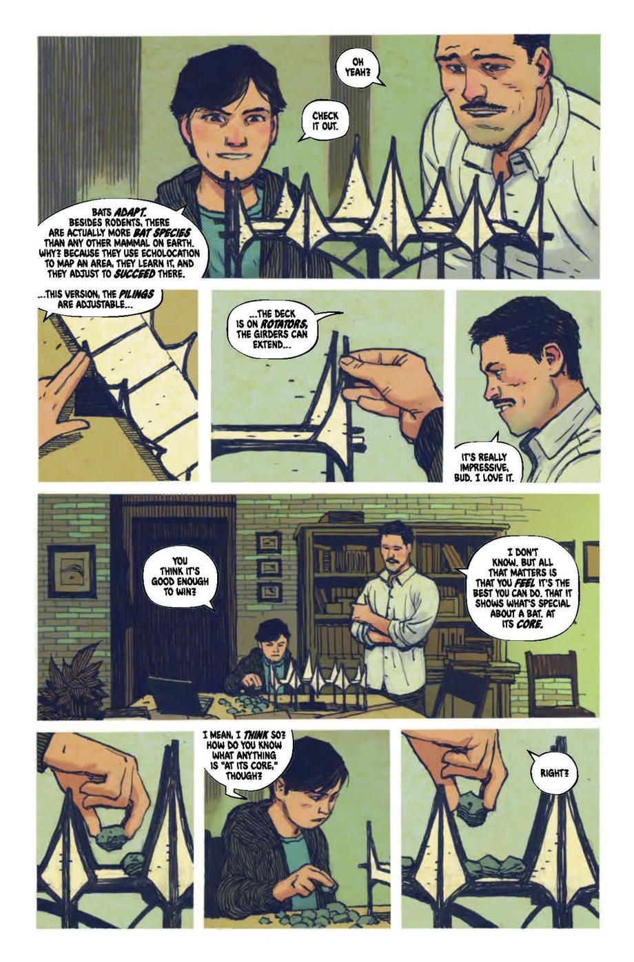 Dispersed throughout the issue at regular intervals is a story about Bruce designing his origami like structures that mimic the wings of a bat. As part of the Young Engineers Competition being held at the zoo, the challenge is to design a bridge for distressed areas many of the animals come from, and the bridge must be themed after an animal. He first designs a bridge that lightly uses the idea but focuses on it being intimidating. Creating an excellent analogy to Gotham, Thomas asks if creating something intimidating is the right move for a place in need. Bruce listens, takes it to heart, and decides it should be the maximum of both. It shouldn't just be intimidating, it should be scary, but it should be for the people who need it, not the people in charge of those who need it. Bruce says it can even be used for defense, but doesn't elaborate much there. Lastly, somehow, the bridge can fly.