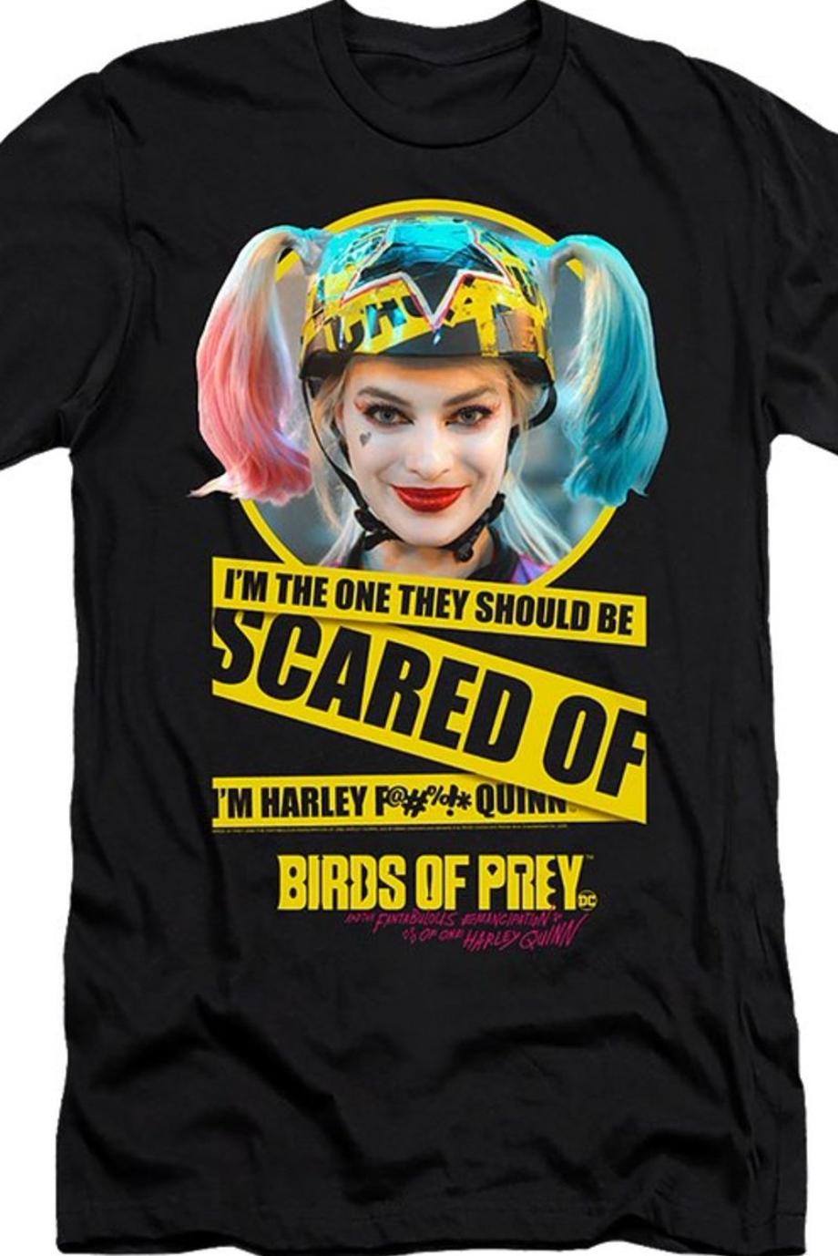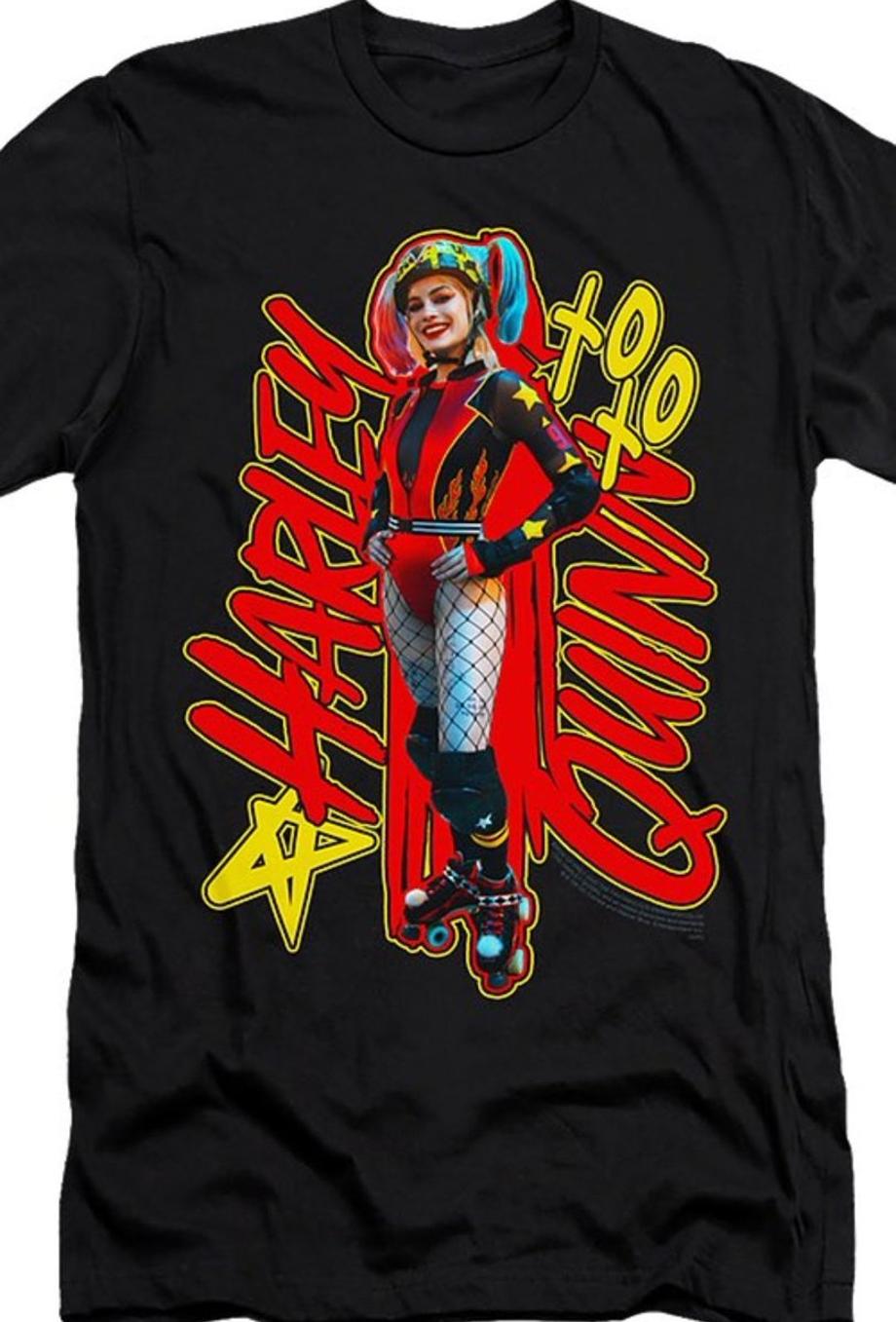 We knew Harley would be donning a version of her black and red roller derby duds from the comics at some point in the DC adaptation thanks to a recent behind-the-scenes video, but these official t-shirt designs give us a much better look at the outfit HQ will almost certainly use to chase down (or escape from) some of Black Mask's goons.
