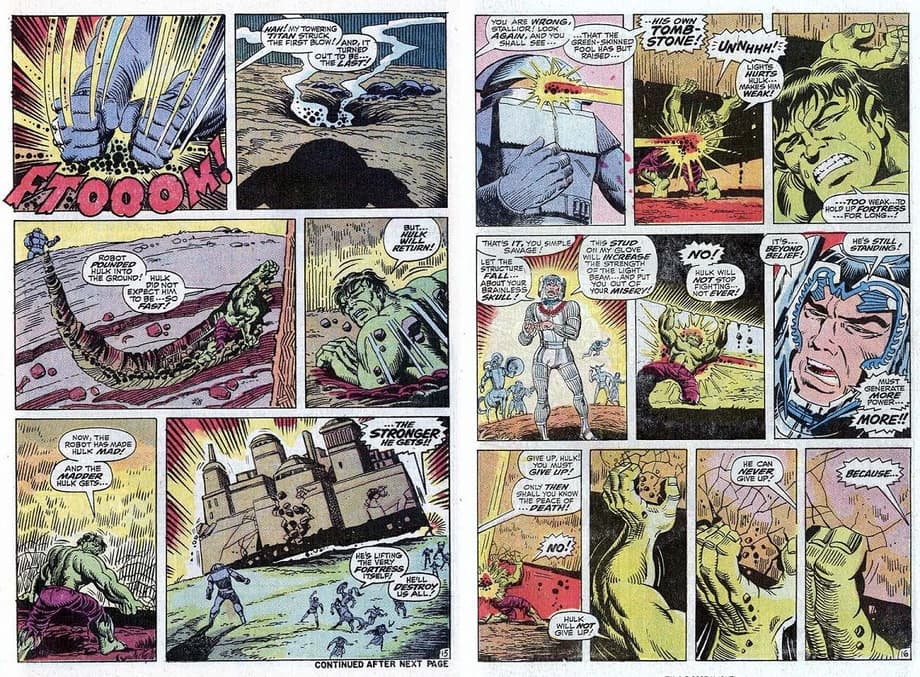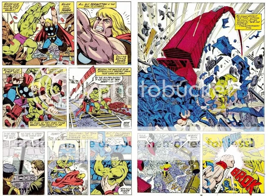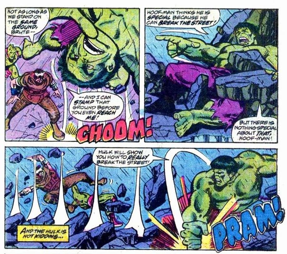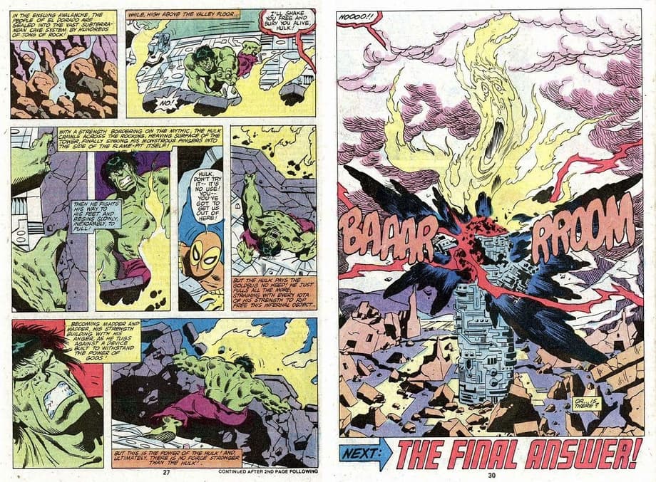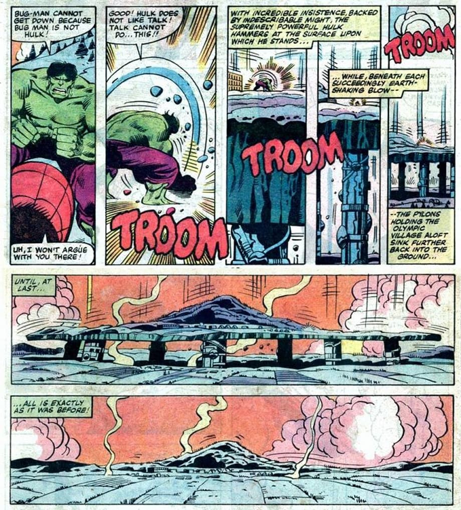 An apt measure of strength, Savage Hulk's punches are some of the most powerful in comics. Here, Savage Hulk hammers down an entire landscape despite it being supported by enormous pylons in Marvel Treasury Edition #25: