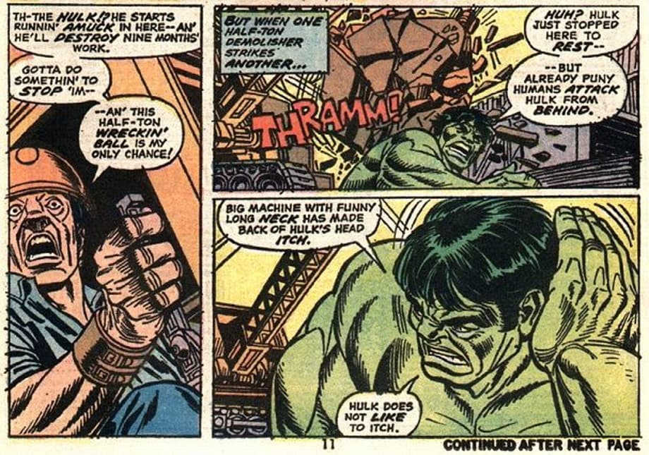 A half-ton wrecking ball to the back of his head only makes the bemused Savage Hulk feel a slight itch in Marvel Team-Up #18: