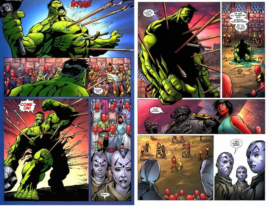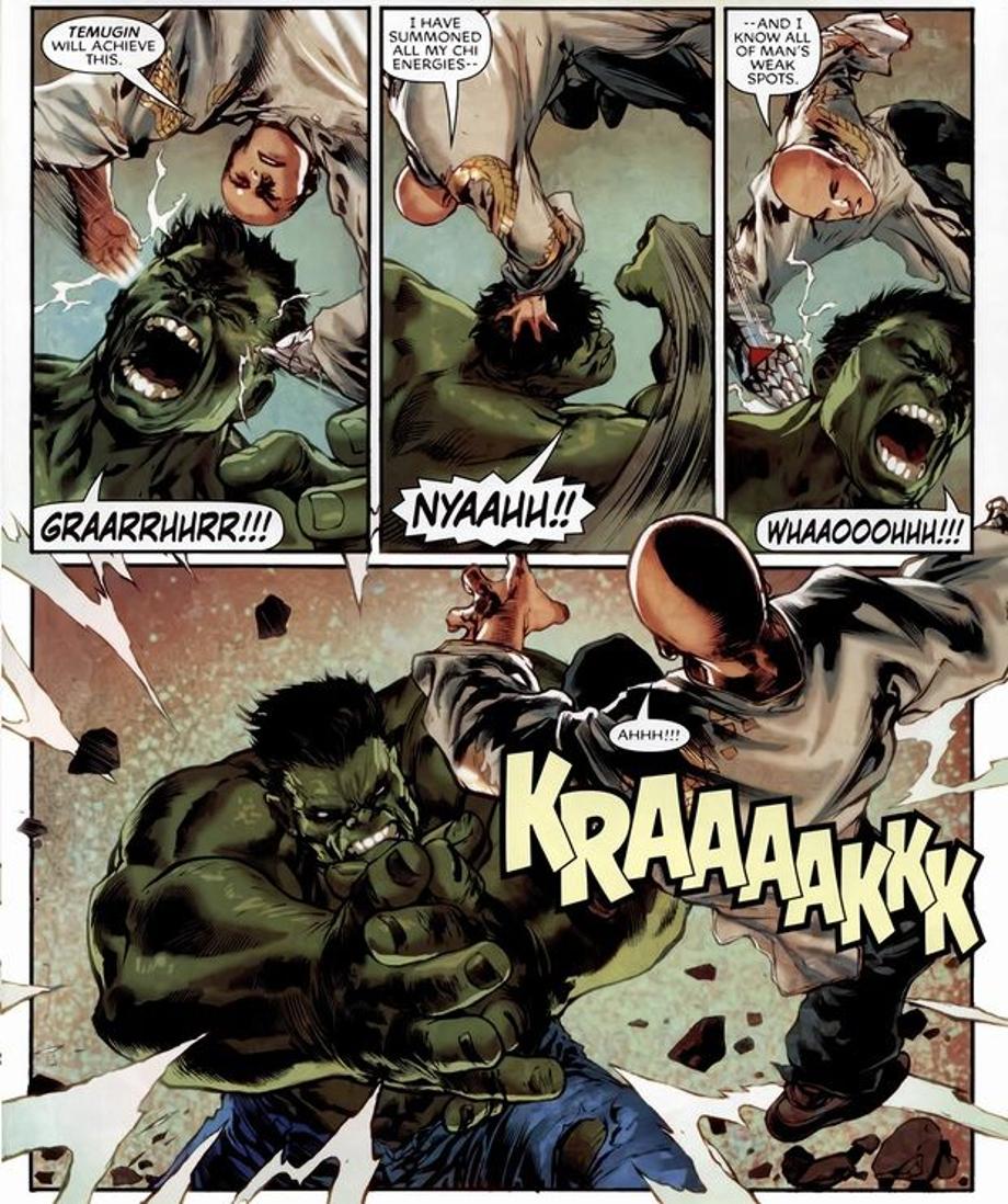 The martial arts master, Temugin, who has torn apart Iron Man's armor with his bare hands, finds that even his chi-enhanced pressure point strikes only make Savage Hulk angrier in Agents of Atlas #8: