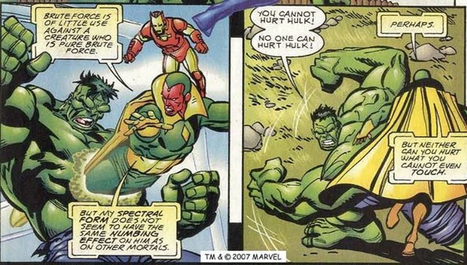 Vision's phasing powers are useless against a raging Savage Hulk in Incredible Hulk vol.2 #27: