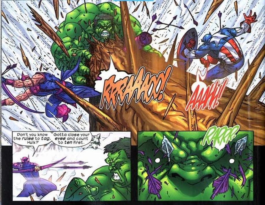 Apparently, Hawkeye's arrows cannot even pierce Savage Hulk's eyeballs in Avengers vol.3 #75: