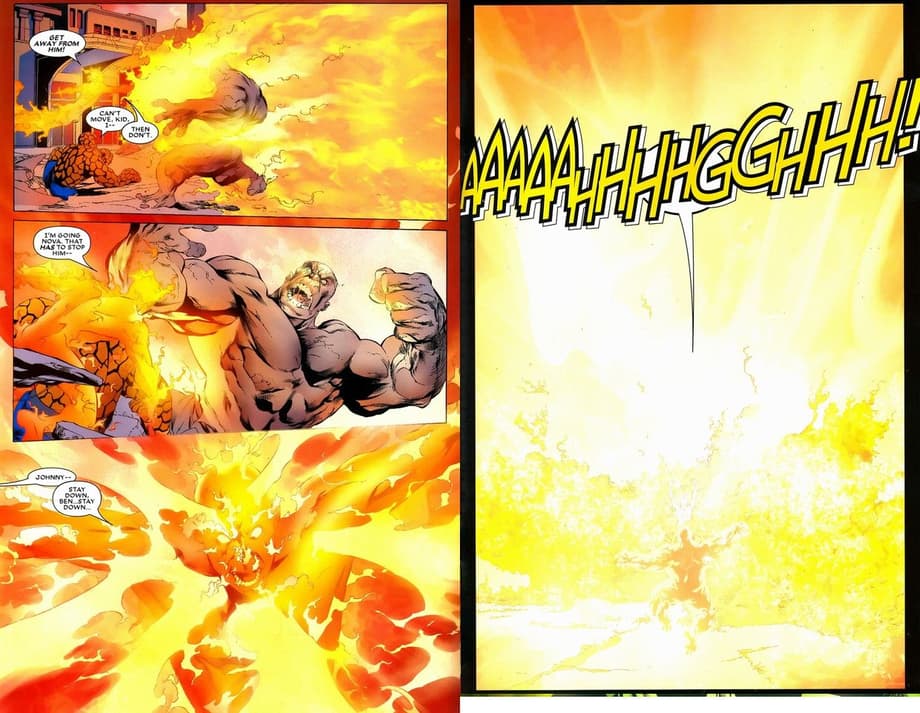Even Human Torch's full nova blast only serves to rouse an amped Savage Hulk from his madness in Fantastic Four #534: