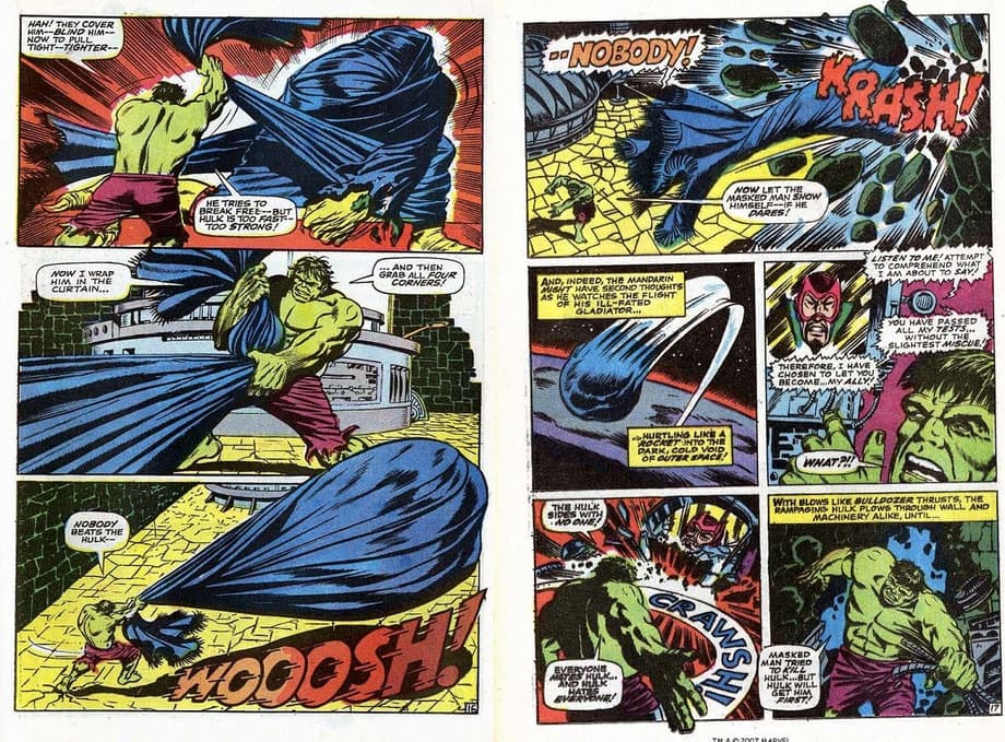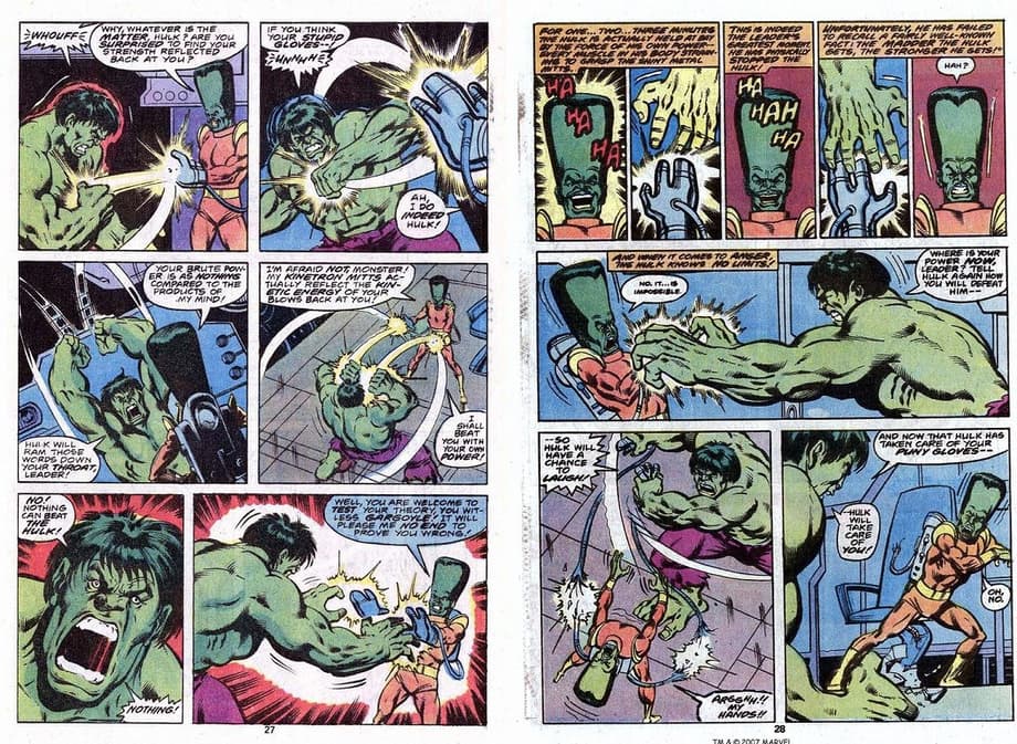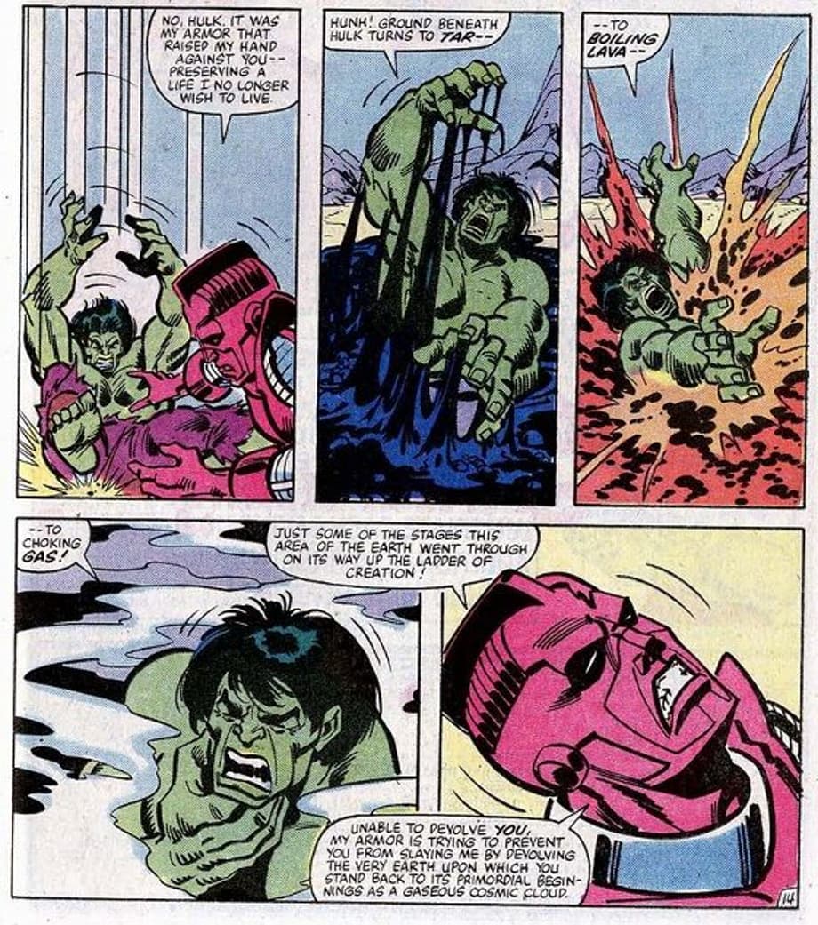 Even an Elder of the Universe is no match as "he presses his struggle with the Gardener... to victory!" From Incredible Hulk #248: