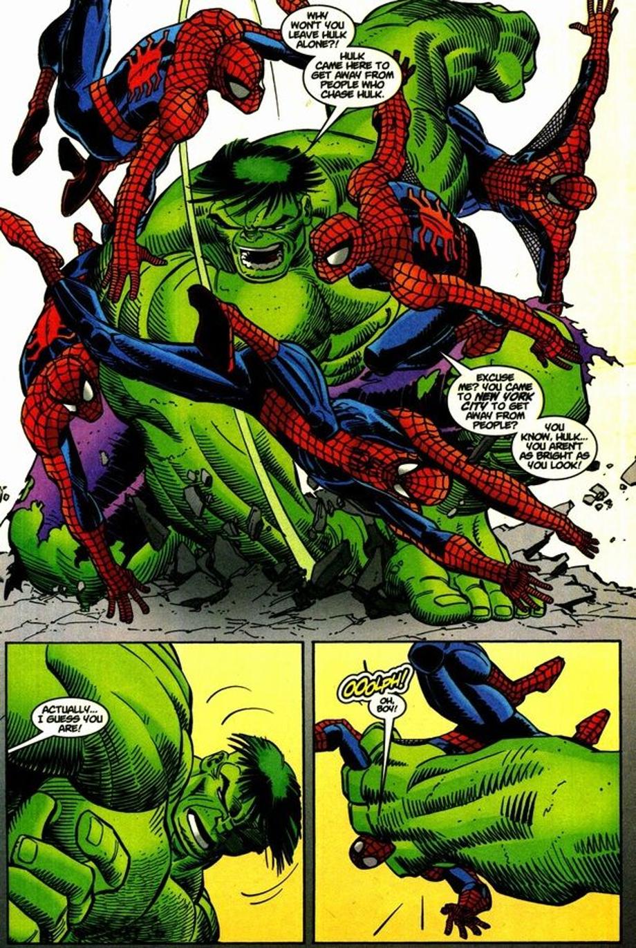 Even the amazing Spider-Man throughout his career can only evade Savage Hulk for so long as shown early on in Amazing Spider-Man #120, and later on in Peter Parker: Spider-Man #14: