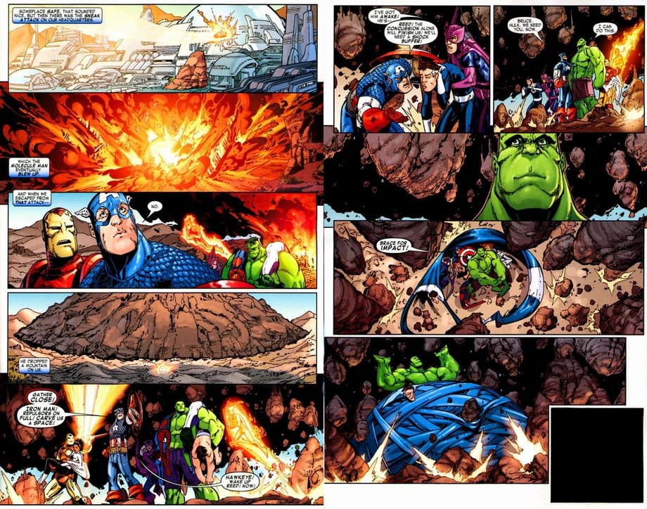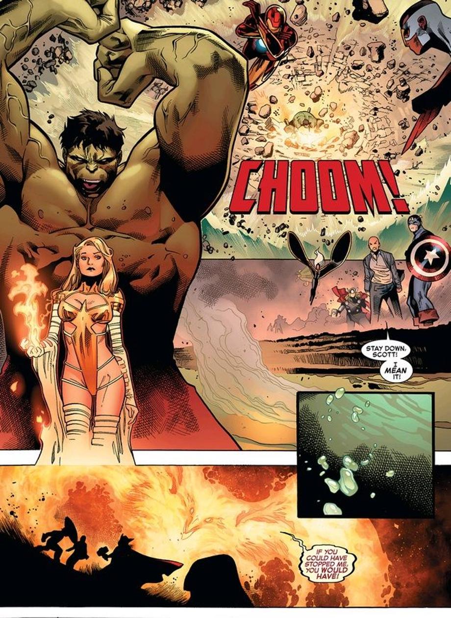 Here, he pounds Phoenix Emma Frost (possessing half of the Phoenix Force) through the island of Utopia into the ocean underneath, from Avengers Vs X-Men #11: