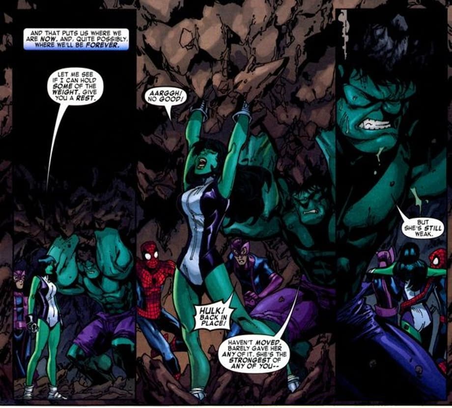 This monumental feat is retold in Spider-Man and the Secret Wars #1, where it's revealed that She-Hulk was completely exhausted when she tried to even support a fraction of the weight: