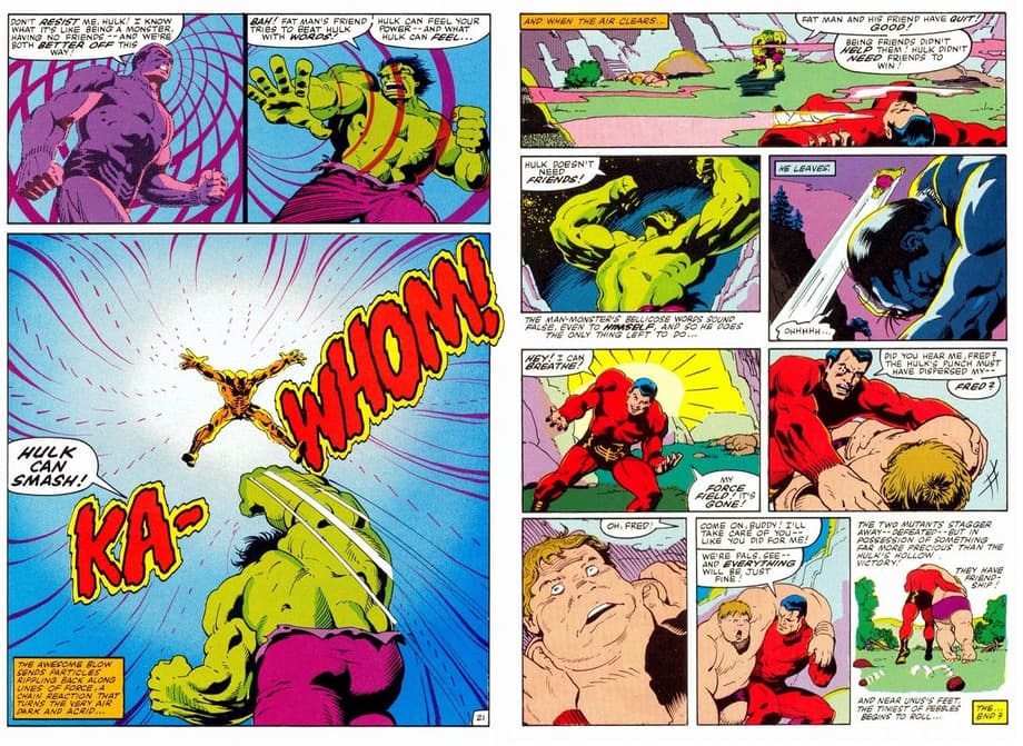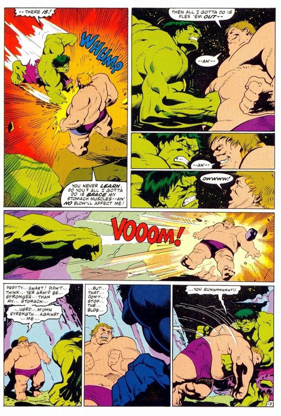 The Immovable Blob is unbelievably struck backwards by the Hulk's punch in Marvel Fanfare #7: