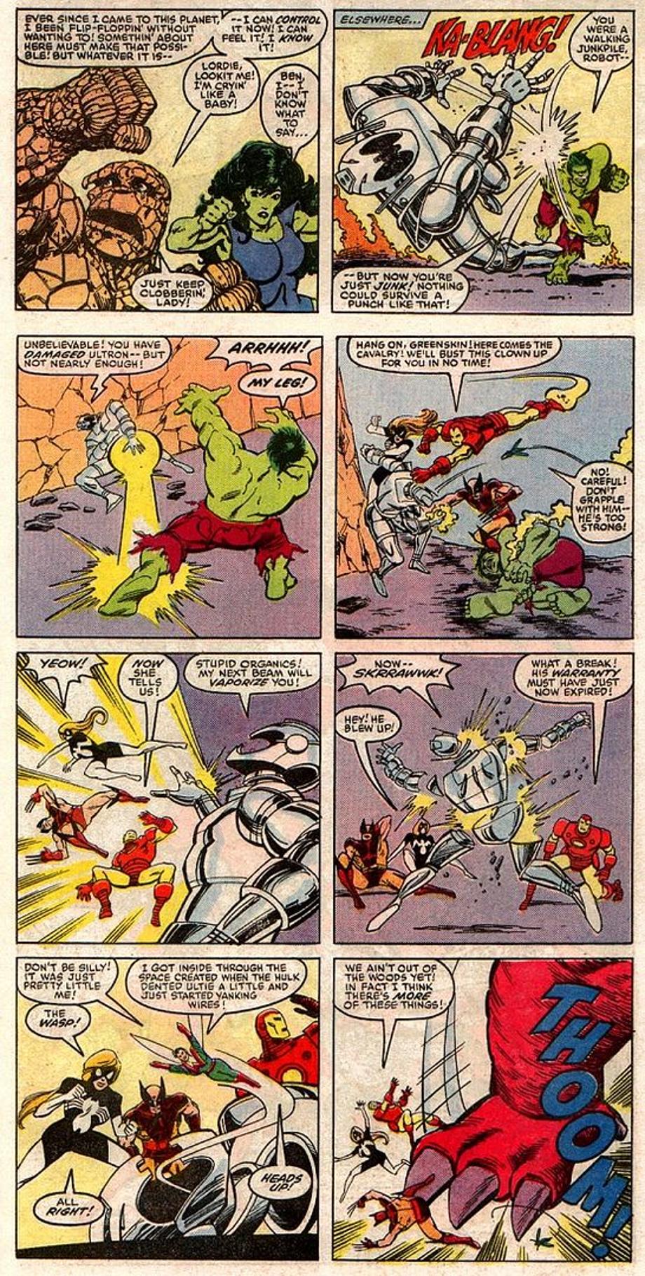 Take note, those of you who opine that Hulk can't withstand Wolverine's adamantium claws. That was Ultron's adamantium neck Hulk shattered with one punch in the first Secret Wars. ;)
