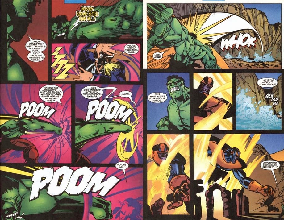 Nate Grey boasts that no physical force has ever pierced his "fully-focused teke-shields," until Savage Hulk does so in X-Man/Hulk '98: