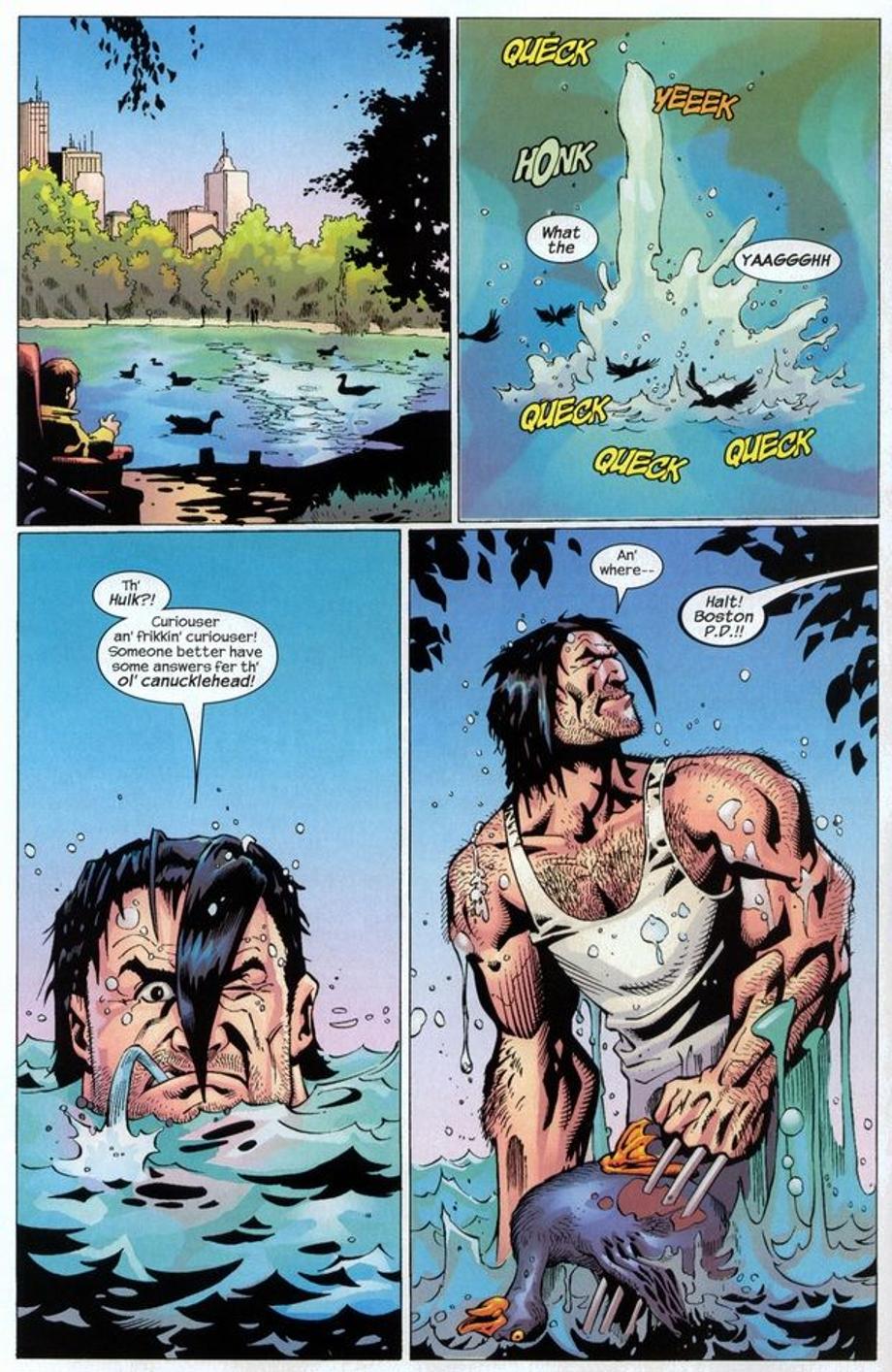 Wolverine amped by Apocalypse as his new Horseman of Death manages to penetrate Savage Hulk's neck when he accidentally impales himself on his claws and the open wound is hammered repeatedly. A moment's pause, however, is all that's required for Savage Hulk's healing factor to regain his bearings and end the fight in Wolverine #145: