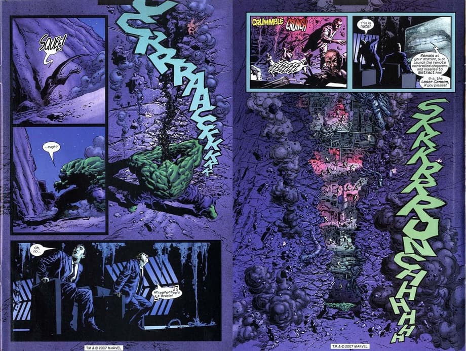 Much like flexing, Savage Hulk has performed enormous feats of tearing things apart. Here, he tears open the side of a mountain base in Incredible Hulk vol.2 #64: