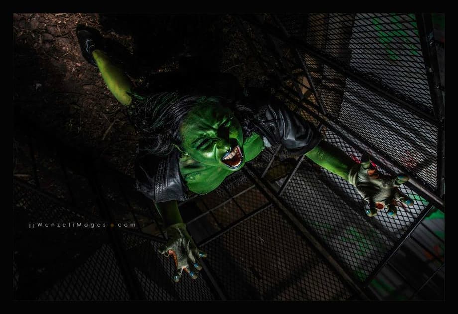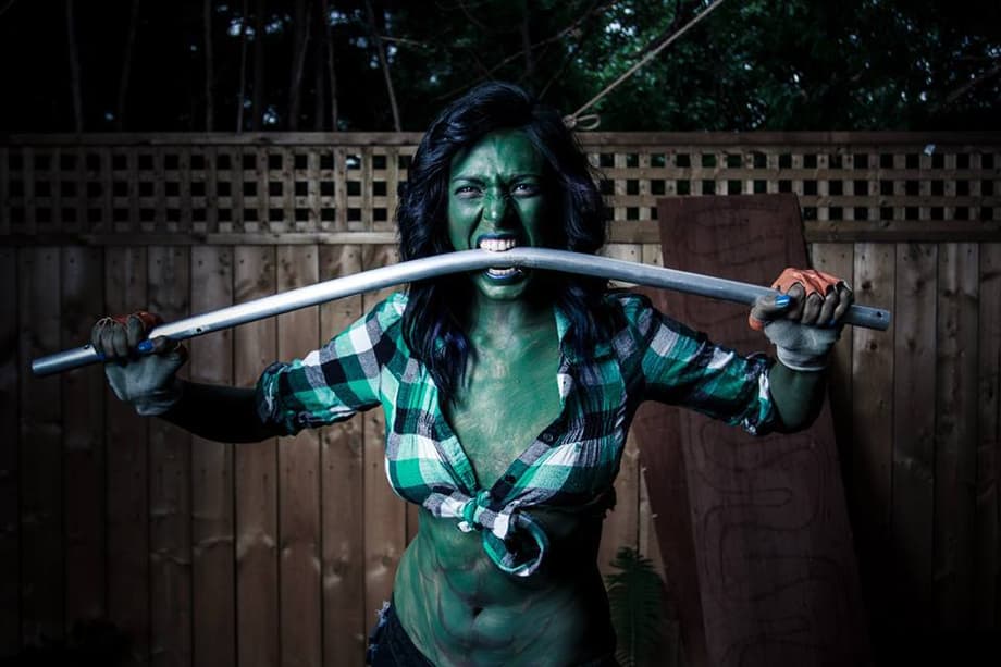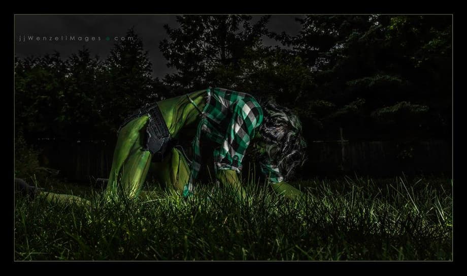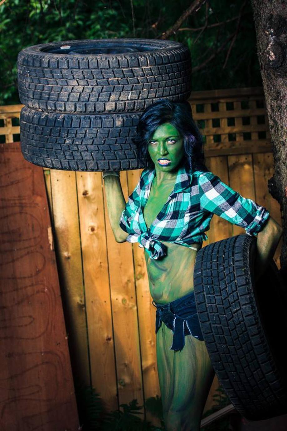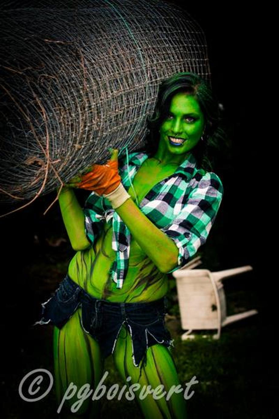 Model and photographer, April V. Skyee, covered head-to-toe in body paint depicting Marvel Comics' emerald-skinned superhero, She-Hulk (Jennifer Walters). The paint was applied by the super-talented artist, William 'Ice' Bloom of Ottawa Gothic Designs.