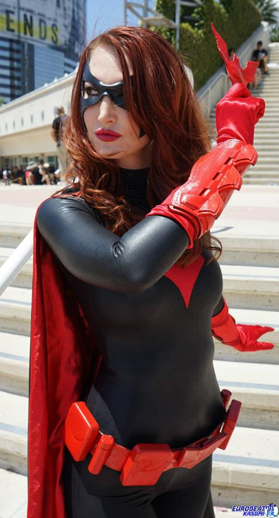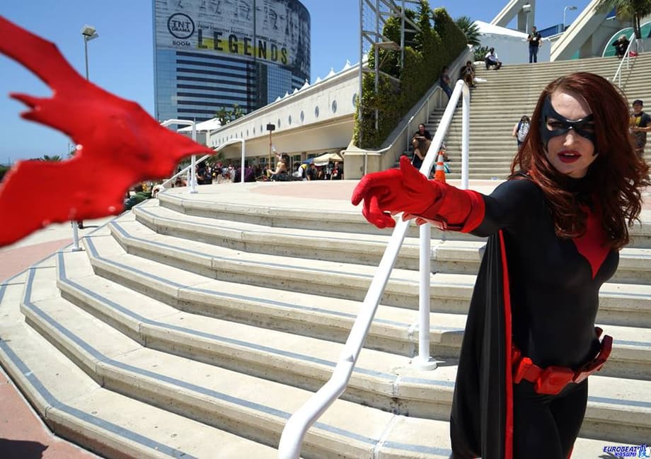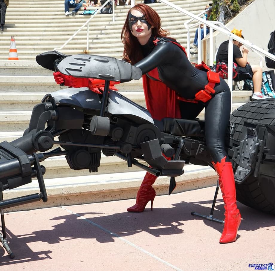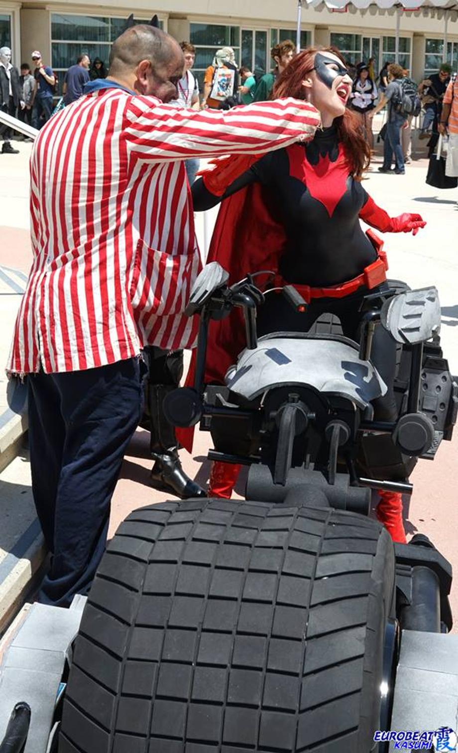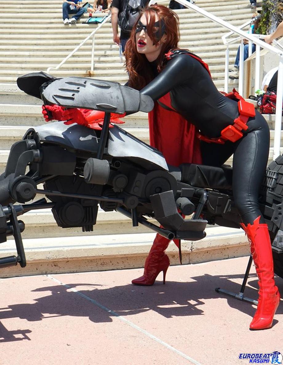 Cosplayer and adult entertainer, Kendra James, was at San Diego's Comic-Con this year. She dressed as DC Comics' Batwoman and posed upon The Dark Knight Rises motorcycle.