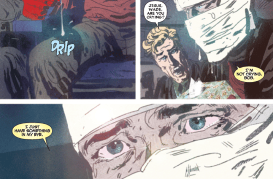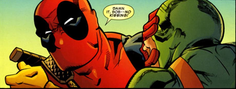 Outside Deadpool thanks Bob by shooting him in the foot and putting his number in Bob's phone adress book, once back at Zeke's Deadpool and Copycat are surronded by armed mercenaries Zeke informs Deadpool he is sorry but it is a set up and Copycat is in on it, Deadpool breaks down to his knee's "No it was not beauty that killed the beast but the bastard the beauty worked for!" Deadpool's mind argues with him that this would be a good chance to surrender but before Deadpool can he is attacked by a large foe from behind and knocked out.