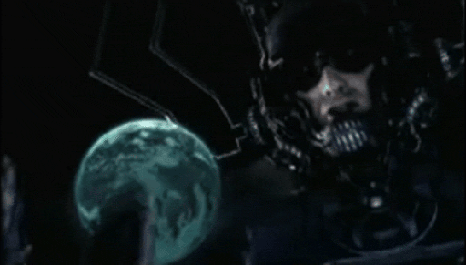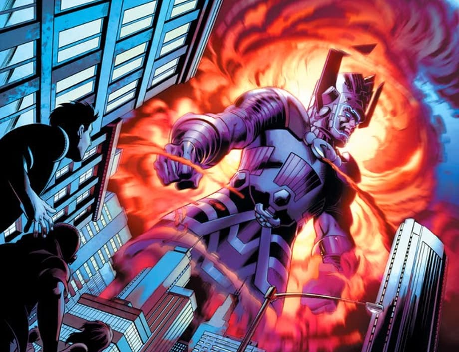 While he is fighting the heroes, Galactus is attacked by someone from behind. It's Thanos, who plans to steal the power of the Devourer of Worlds. Galactus turns his attention to Thanos and tries to kill him. Thanos is heavily injured and decides to flee, claiming that he has greater plans and that soon all the galaxy would perish. The heroes continue with their plan to teleport Galactus and they succeed.