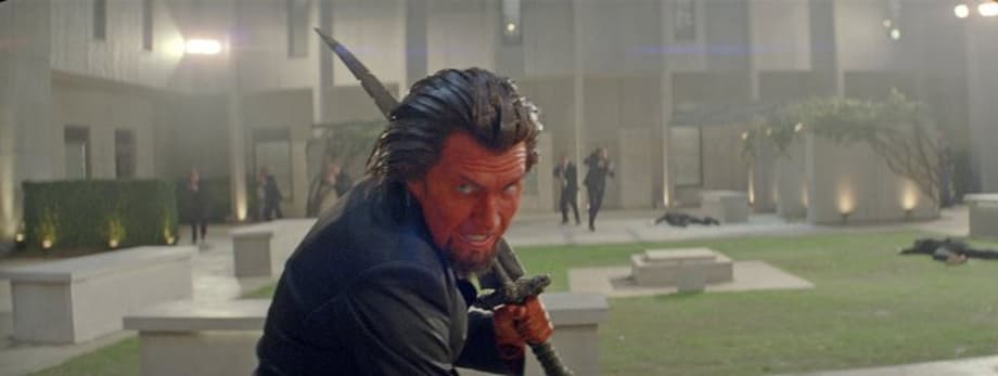 That was the moment that Azazel teleported into the room, his arm around Mystique. Azazel grabbed the man who was attempting to handcuff Emma, and socked him in the jaw. Then he grabbed one of the men on top of Emma, teleported him away, and slammed him into one of the walls. He did this repeatedly, sometimes taking two at a time, sometimes yanking them away with his tale. Mystique contributed as well, pulling off several guards and punching them until they lost consciousness.