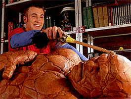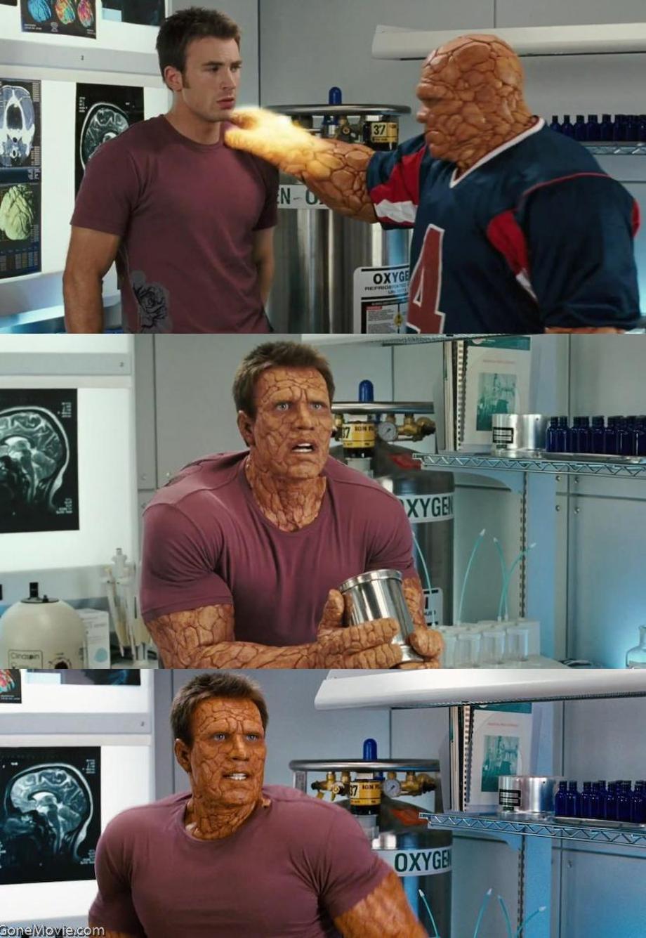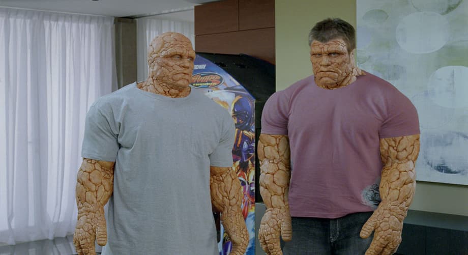 Fantastic Four: Rise of the Silver Surfer, Johnny Storm, played by Chris Evans ("Captain America: The Winter Soldier") has an encounter with the Silver Surfer that allows him to swap superpowers with members of his superhero team. In one memorable scene, Ben Grimm/Thing, played by Michael Chiklis ("The Commish"), is intrigued by Johnny's new ability and when he touches Johnny, Ben swaps his Thing form for Johnny's Human Torch powers. Flame on! Of course, Johnny is not pleased with his new rock-like skin and freaks out. It's a fairly humorous scene, but it could've looked a bit different. The image above, that's a piece of concept art that artist Dark Hoffman rendered for the film. As you can see, it is a much bulkier version of a transformed Johnny Storm as compared to the theaterical version that was ultimately chosen. Images of the final version and a video of that scene are below. Do you guys/gals prefer the final or the alternate design?