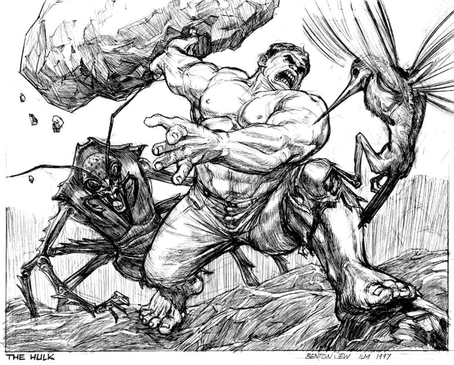 It's interesting to see the "Insect Men" from the Hensleigh script in Benton's work. You can get a better look at them from Kerry Gammill's site. http://gammillustrations.bizland.com/monsterart/hulk.htm