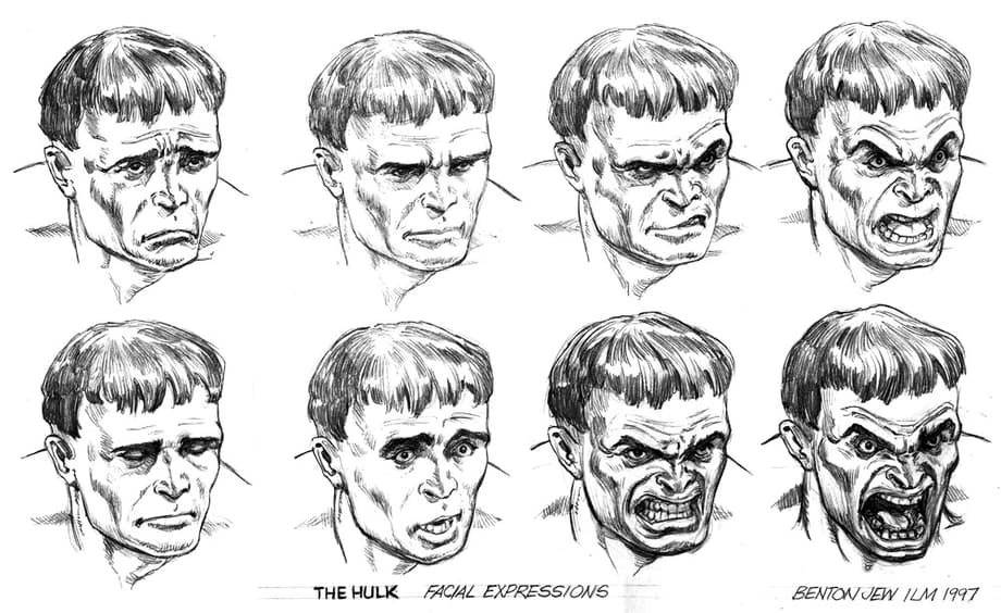 "The first version I did was a bid that ILM was doing to get work on a 1997 version of the Hulk. This one was to be directed by Jonathan Hensleigh and feature The Absorbing Man amongst other monster types as the bad guys. We did quite a few pencil sketches to get an idea of what he might look like." - Benton Jew