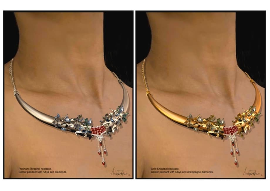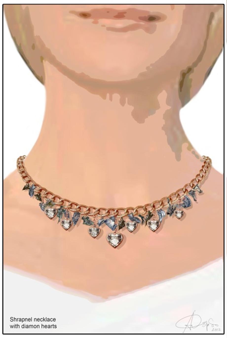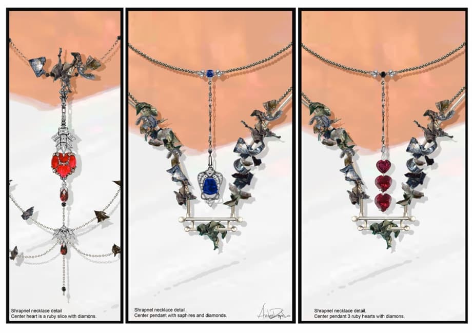 Iron Man 3, Tony Stark (Robert Downey Jr.) has the shrapnel surgically removed from his chest. Then the film cuts away to a scene of Tony placing a necklace, with a heart-shaped pendant, around Pepper Potts' neck. That piece of jewelry is actually supposed to be made from Tony's shrapnel fragments that had been recently extracted. Sadly, none of Andrea's lovely designs below were used in the film.