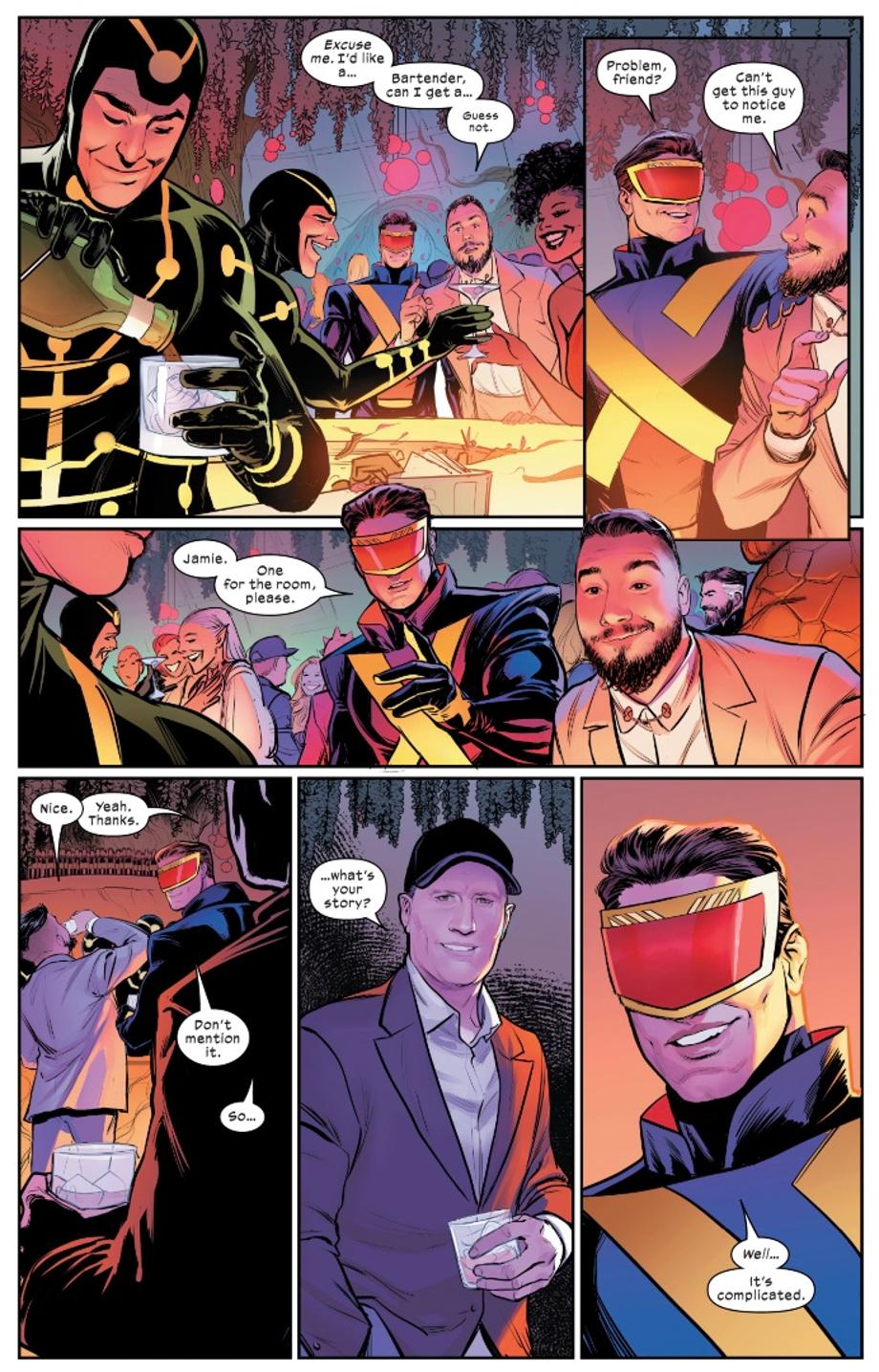 In a fun meta moment during the latest chapter in the Gala storyline, Feige approaches Cyclops and asks, "So, what's your story?" Summers proceeds to fill the Marvel head honcho in on the history of the X-Men and how they wound up in their current situation.