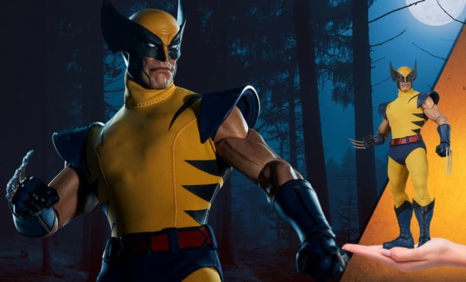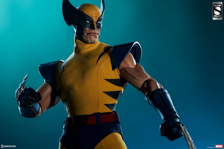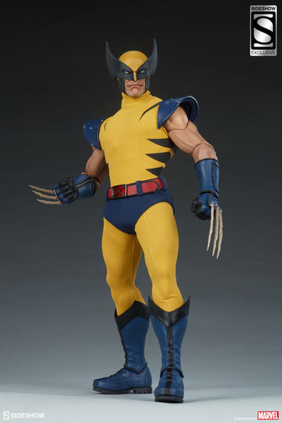 The Wolverine Sixth Scale Figure features a comic-inspired head sculpt of everyone’s favorite feral mutant, with a stern expression beneath his yellow and black finned cowl. Wolverine’s costume includes a yellow fabric bodysuit with black stripes, a set of blue fabric briefs, and a red fabric belt with an ‘X’ buckle. His classic costume also has sculpted elements like distressed blue shoulder armor as well as blue and black gauntlets and two-part boots.