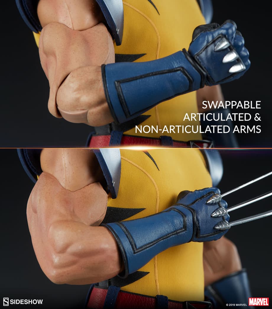 For further configurations, the Wolverine Sixth Scale Figure includes three sets of muscular, swappable arms- a pair of articulated arms, a pair of non-articulated bent arms, and a pair of non-articulated straight arms. Unleash this iconic Marvel hero’s full fury with this variety of vicious accessories and display options.