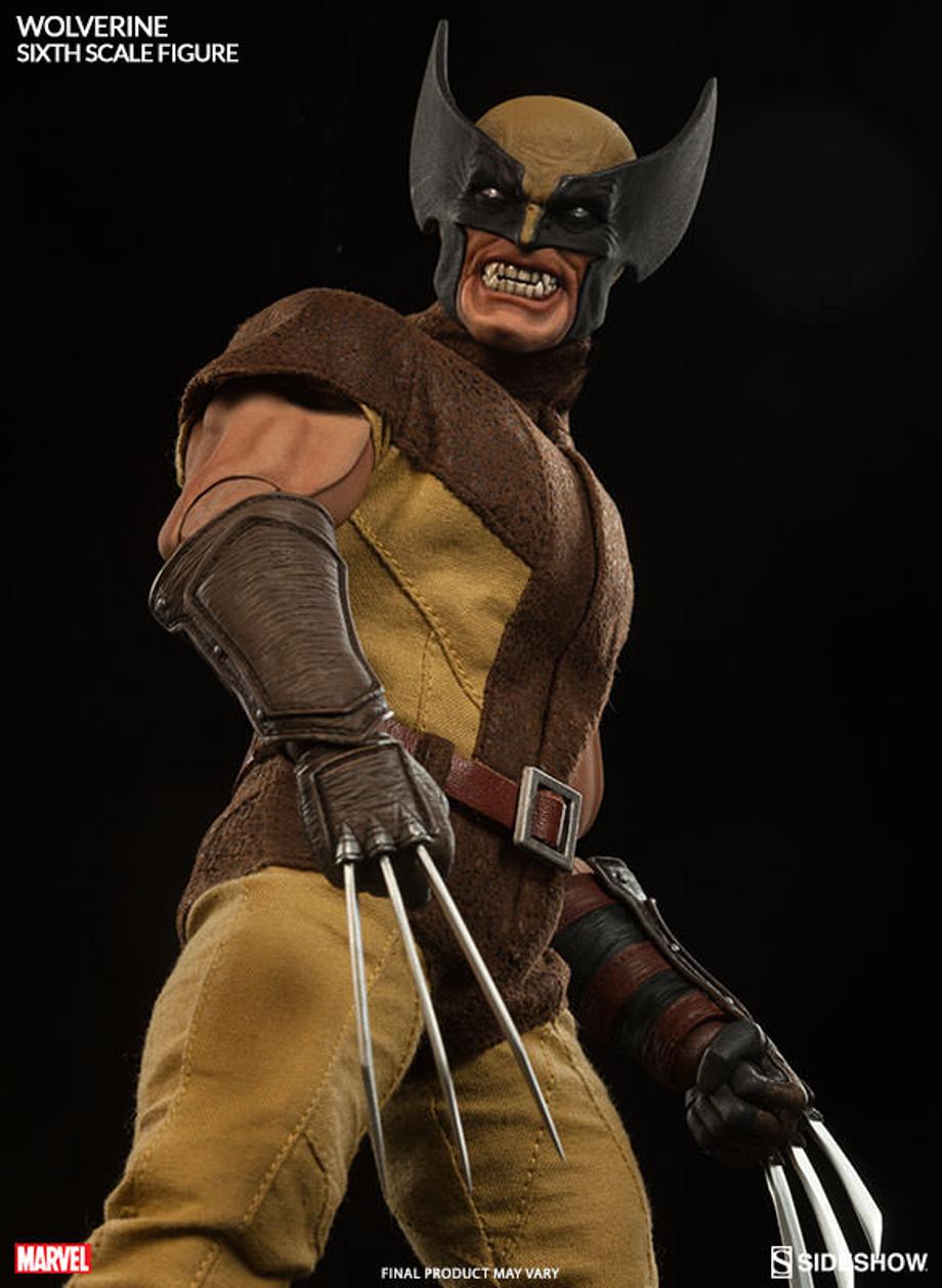 The 2015 brown-and-yellow sixth scale Wolverine. The ultra-realistic material of the costume was very divisive, which likely influenced the spandex look of the new blue-and-yellow figure.