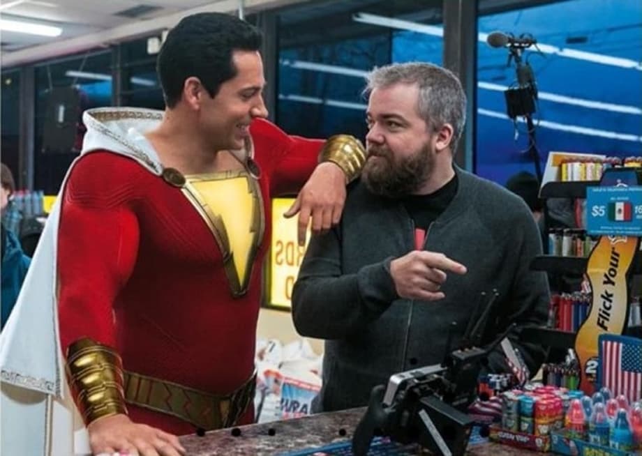 This behind the scenes image shows Zachary Levi's Shazam alongside director David F. Sandberg who is making the leap from the world of horror to superheroes for the DC Comics adaptation.