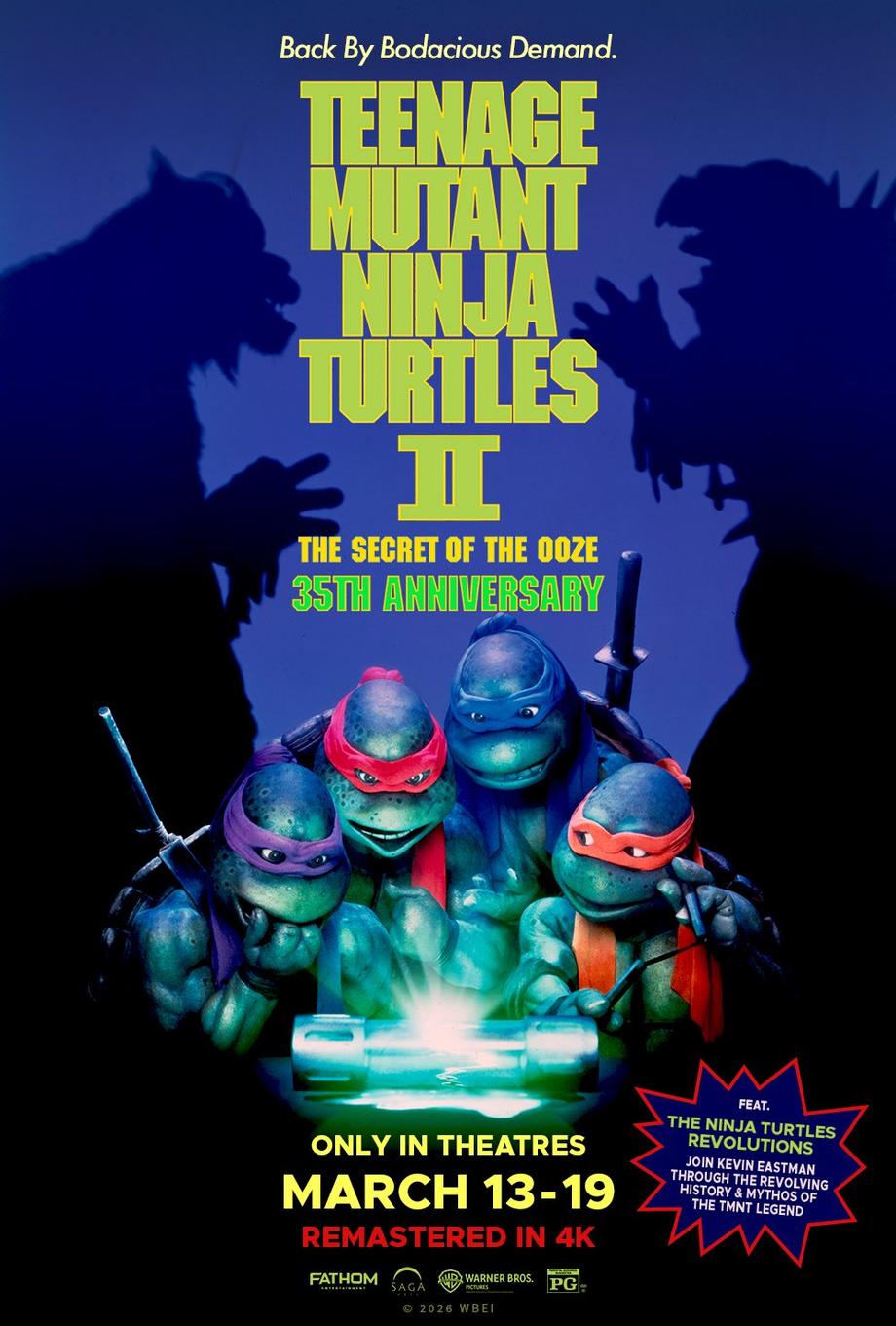 Fathom Entertainment, Saga Arts and Warner Bros. Pictures will re-release Teenage Mutant Ninja Turtles II: The Secret of the Ooze in theaters nationwide for a one-week, 35th anniversary run from March 13–19. The movie will be presented theatrically in a newly restored 4K format for the first time. The re-release will also feature exclusive bonus content, including a never-before-seen featurette titled The Ninja Turtles: Revolutions, which will screen before the film.