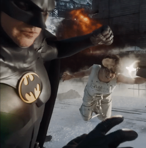An old man with a grey beard and long hair (we spotted Michael Keaton rocking that look in the "Big Game" TV spot), he supposedly turns to the duo and asks, "You want to get nuts?" when they confront him. After he too comes to the conclusion The Flash has broken the universe, the retired Caped Crusader attempts to send the duo packing.
