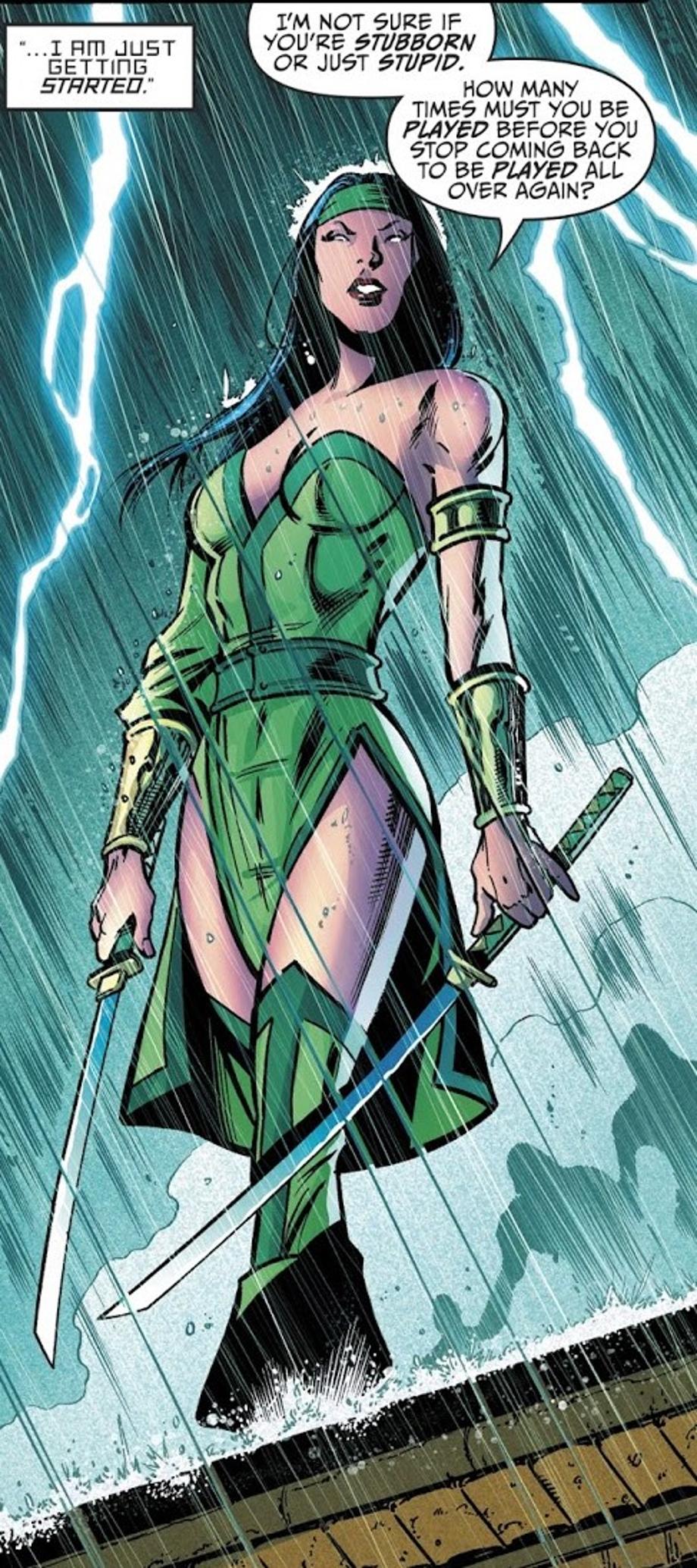 Donna prepares to punch Cheshire right out the window. Jade tells Donna she doesn’t want to do that. Donna asks angrily why not. Cheshire tells Donna she needs her help again, and Donna begins to laugh. Why would she ever help Cheshire again? She sent her into a trap so Professor Zoom could experiment on her! Jade understands, in the same situation, she would more quickly slit the other person's throat than make the choice to help them again, that’s why… Donna doesn’t have a choice. Cheshire tells Donna if she doesn’t help her, she’ll release secretly taken footage of Donna taking the Medusa Mask from prison, and delivering it to known criminals Cheshire and Professor Zoom. What would the Justice League think? What would Wonder Woman think? What would Roy think? Donna tells Cheshire that she could explain that, tell the full story, Roy would understand. Cheshire asks Donna what Roy would think once she explained the full story, about Donna never telling him he had a daughter!